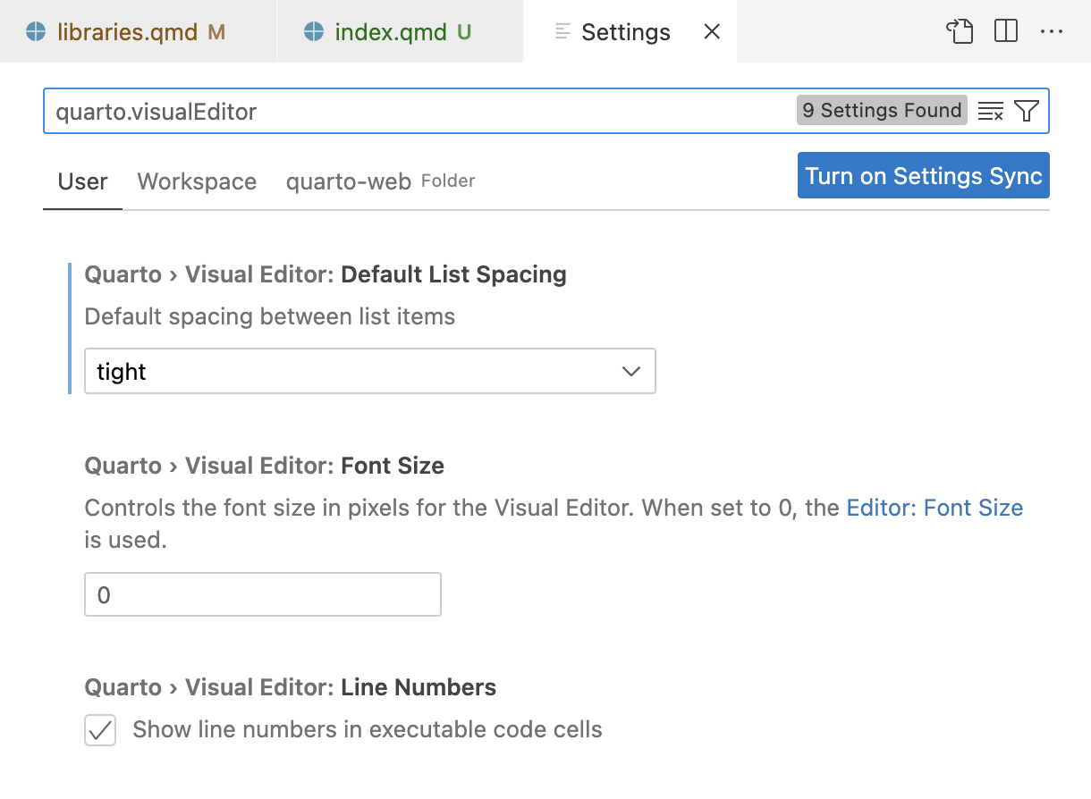 There are a variety of VS Code options available to configure the behavior of the visual editor. You can locate these options by filtering on quarto.visualEditor